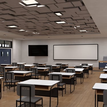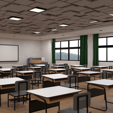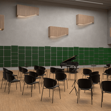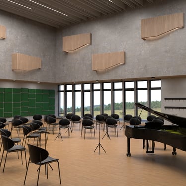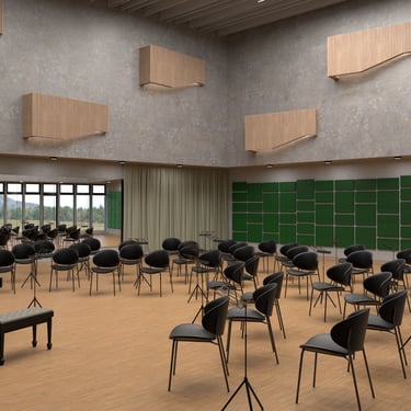 Parametric acoustic model created to analyse sound insulation between rooms and optimize reverberation control within classrooms and rehearsal rooms. The results informed design decisions on materials, geometry, and finishes to achieve optimal acoustic comfort, speech clarity, and sound balance.