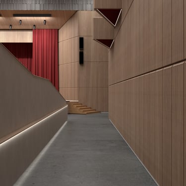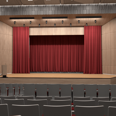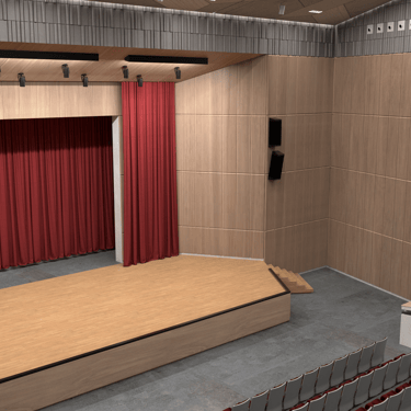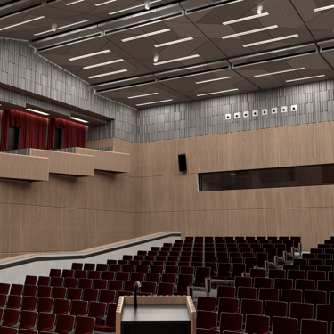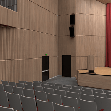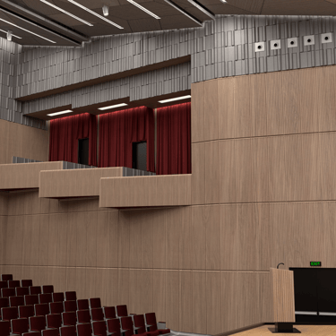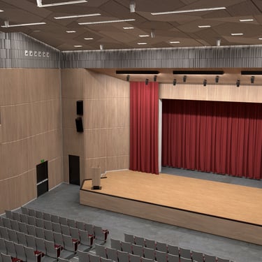 Acoustic model and design for a performance venue focused on achieving uniform sound distribution, sound reinforcement systems, appropriate reverberation time, and balanced tonal response. The solutions ensured clarity and richness for both performers and audiences.